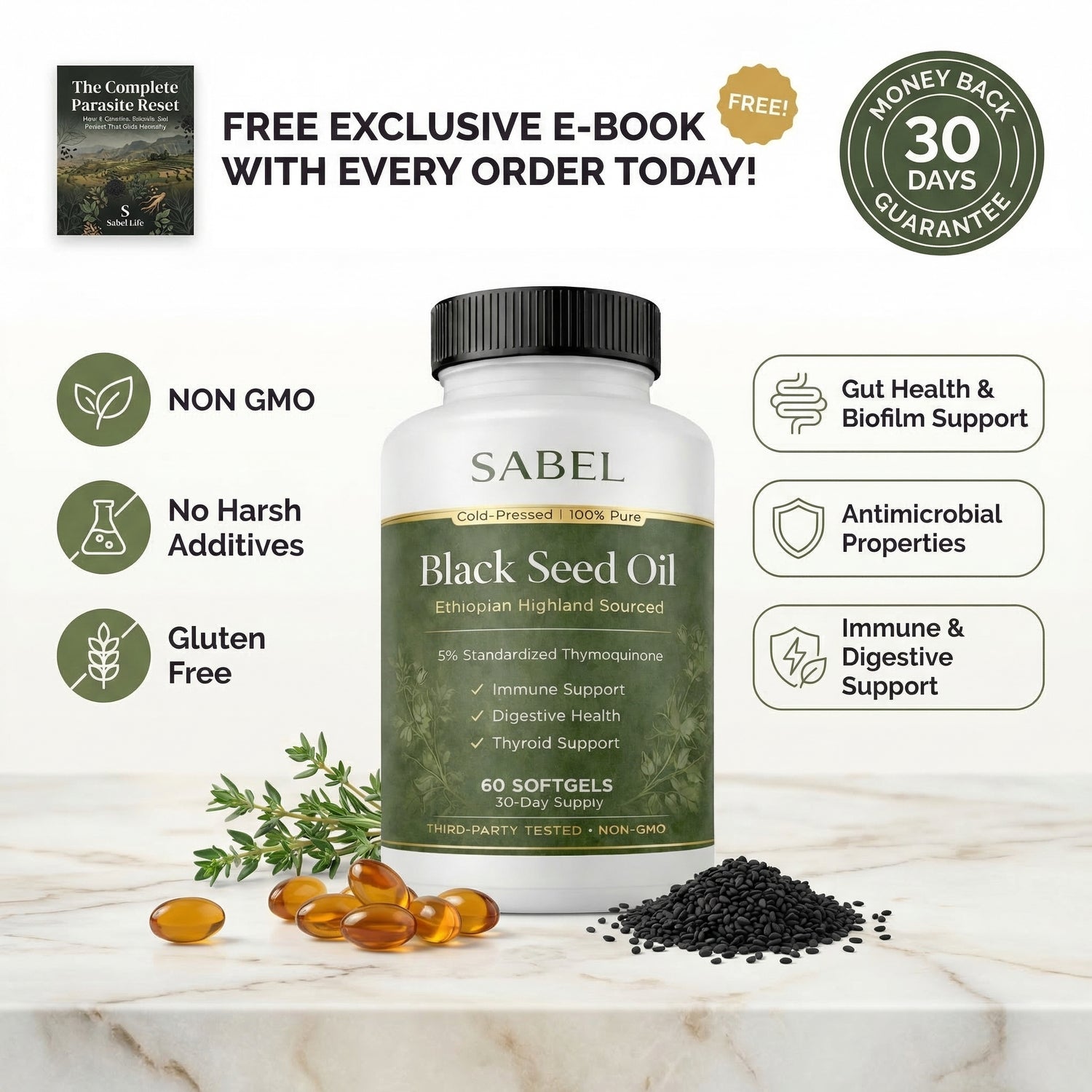 Sabel Life delivers 5% standardized thymoquinone — the Ethiopian highland compound clinically studied for its effect on TPO antibodies. Two softgels before bed. No diet overhaul. No new prescription.